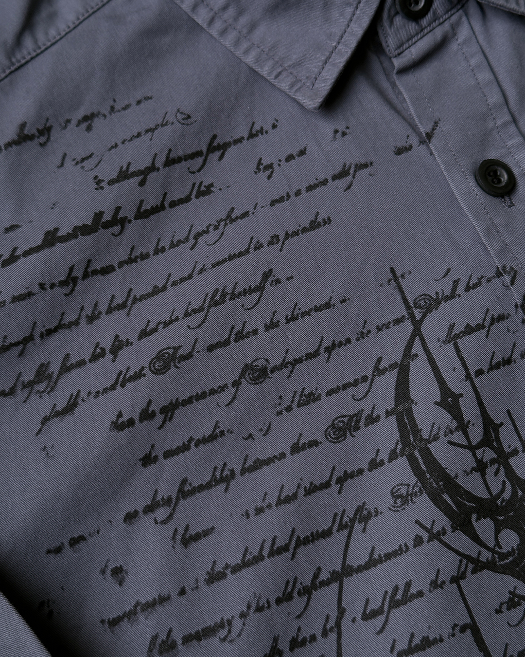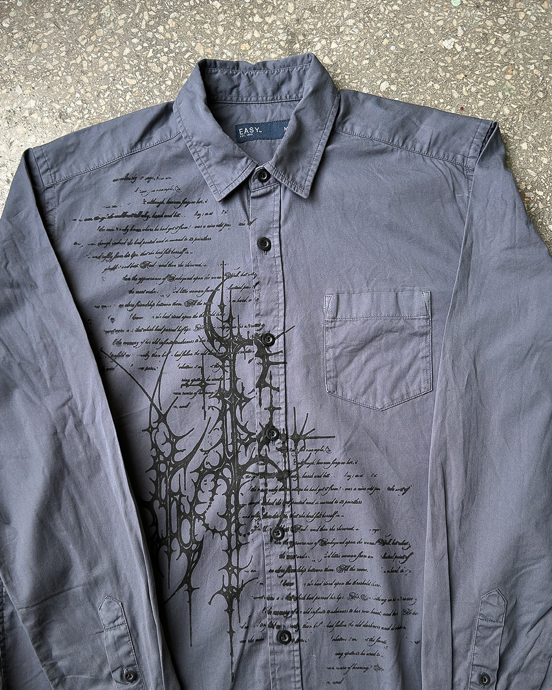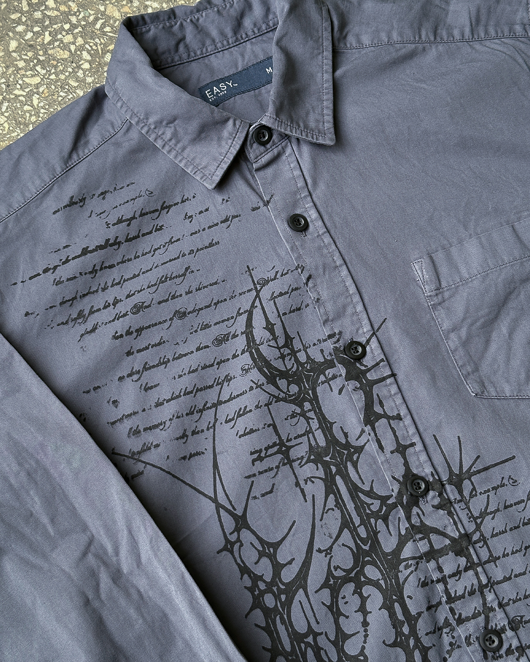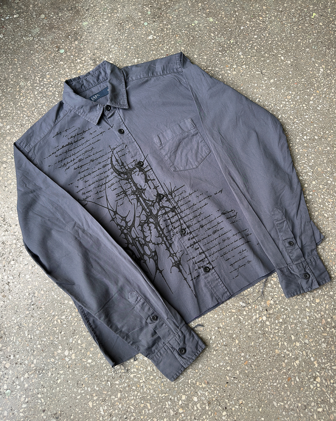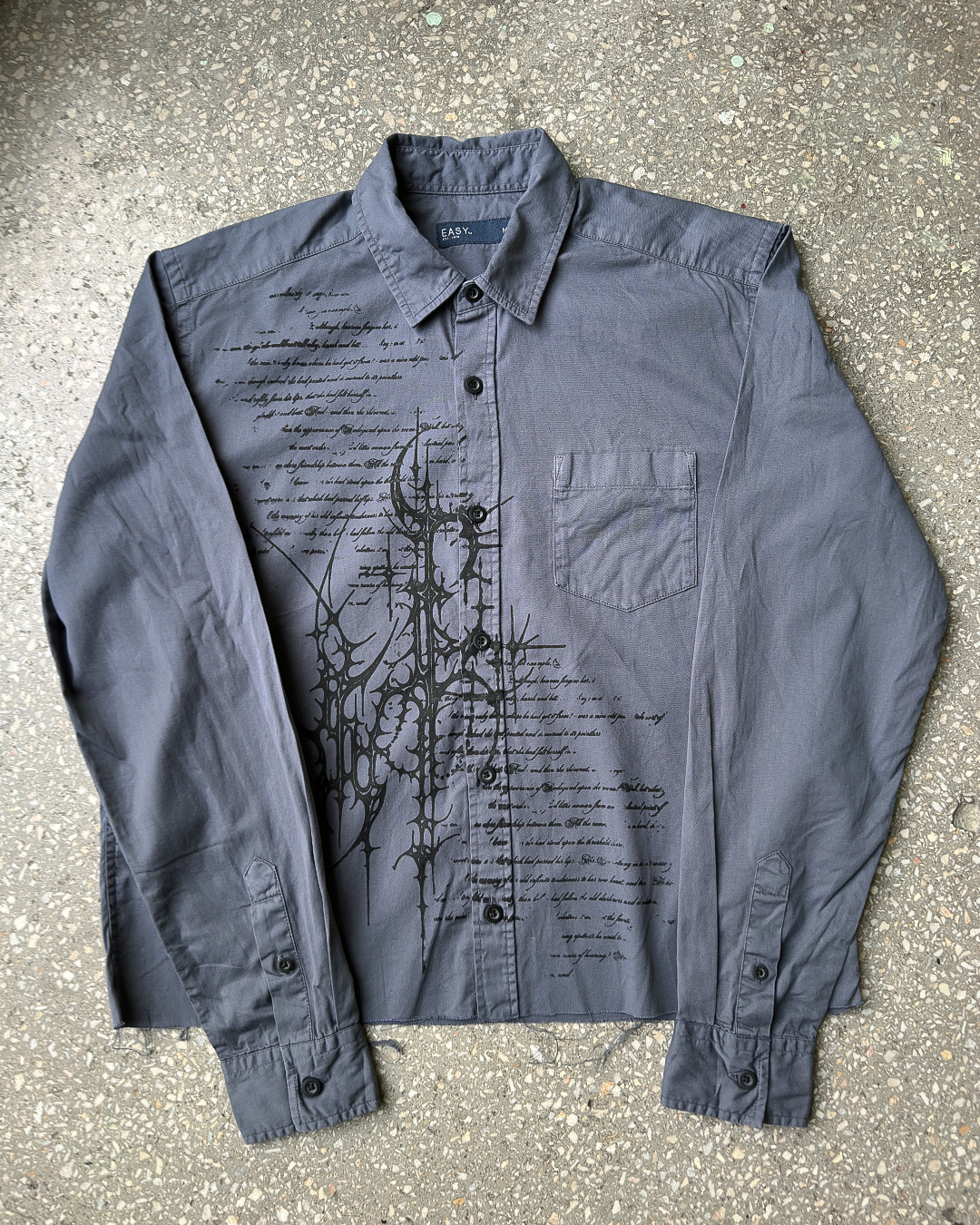 Unikatowa koszula pochodząca z drugiego obiegu, która została przerobiona i zyskała nowe życie. Ozdobiona autorską grafiką naniesioną metodą sitodruku. Surowe wykończenie dołu koszuli.