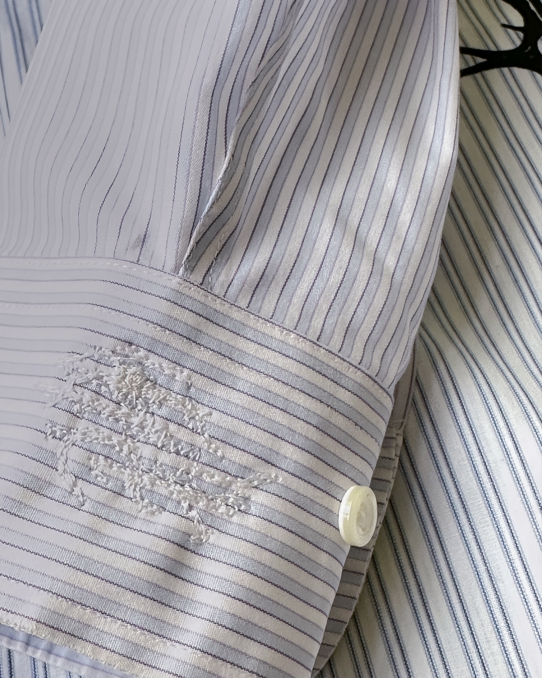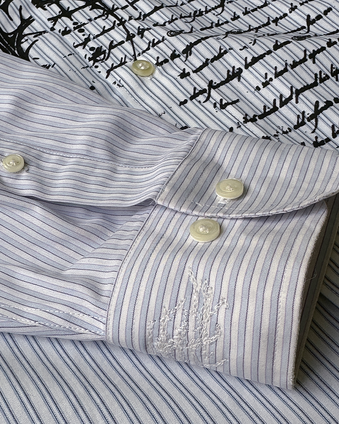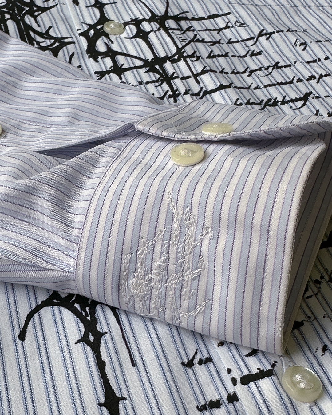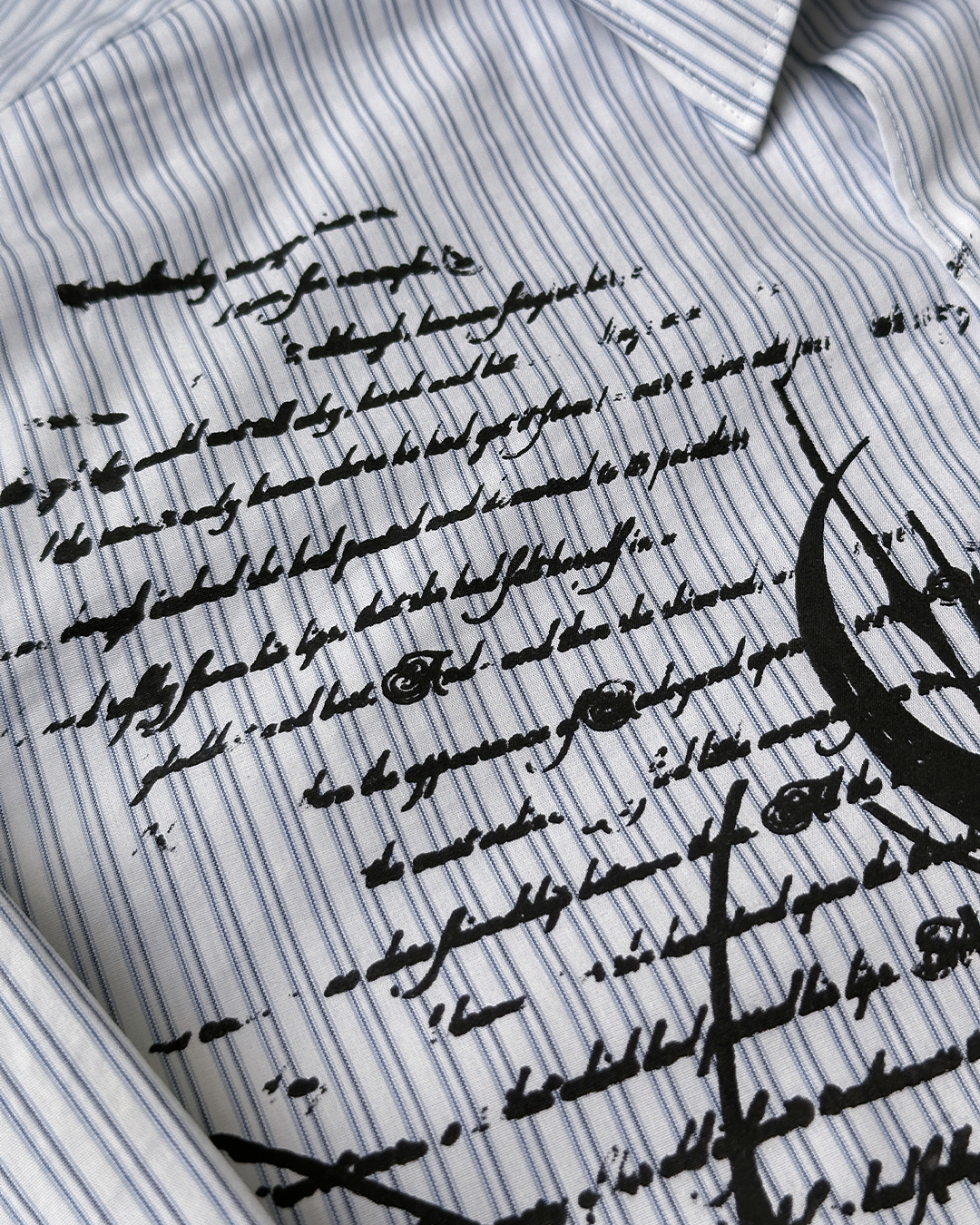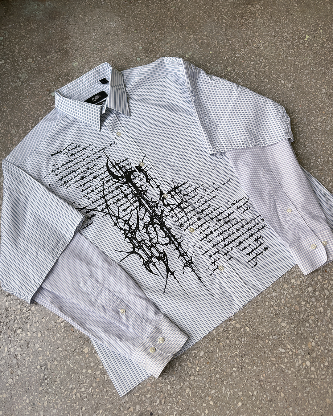 Unikatowa koszula pochodząca z drugiego obiegu, która została przerobiona i zyskała nowe życie. Ozdobiona autorską grafiką naniesioną metodą sitodruku. Surowe wykończenie dołu koszuli. Podwójny rękaw.