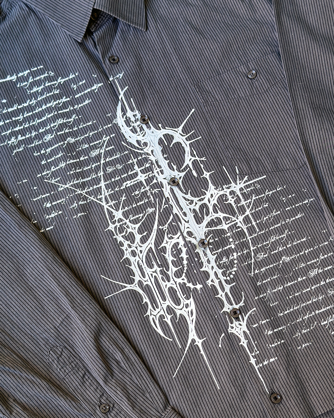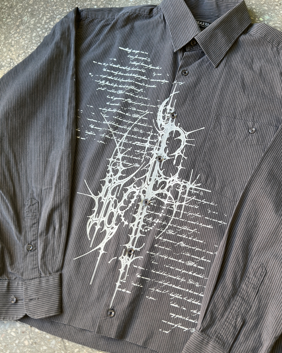 Unikatowa koszula pochodząca z drugiego obiegu, która została przerobiona i zyskała nowe życie. Ozdobiona autorską grafiką naniesioną metodą sitodruku. Surowe wykończenie dołu koszuli.