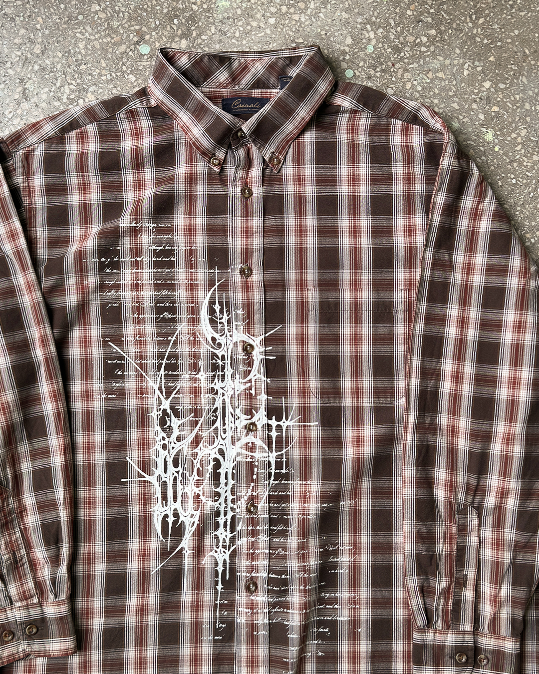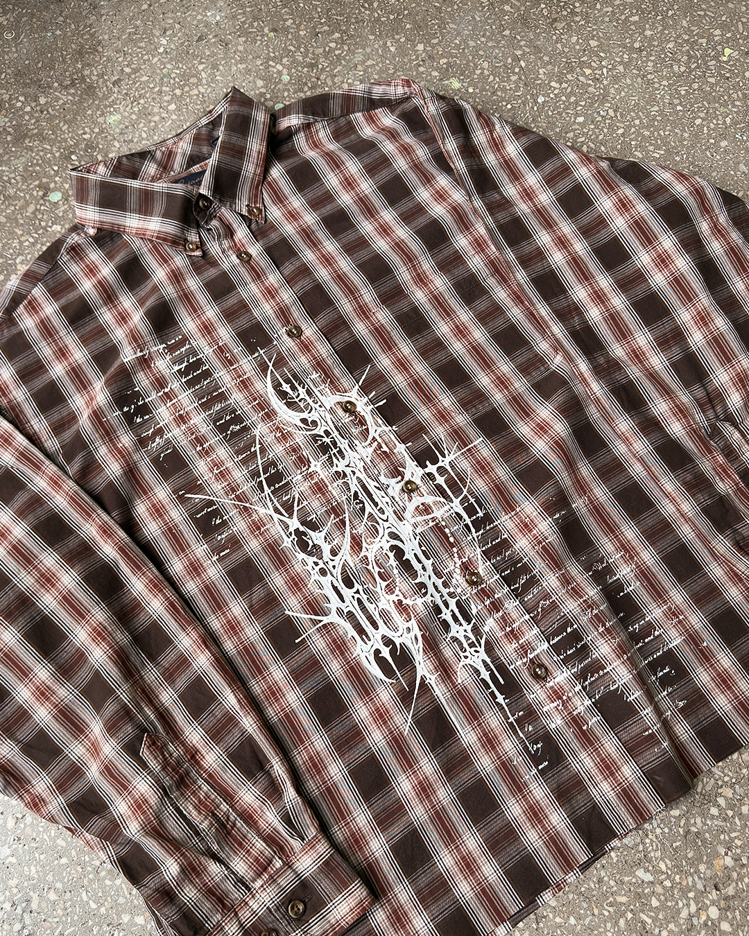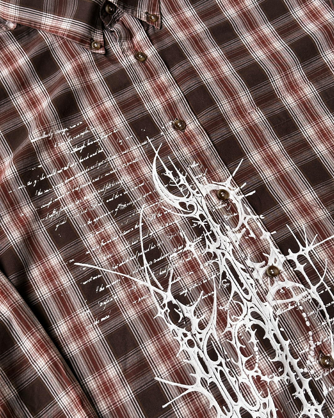 Unikatowa koszula pochodząca z drugiego obiegu, która została przerobiona i zyskała nowe życie. Ozdobiona autorską grafiką naniesioną metodą sitodruku. Surowe wykończenie dołu koszuli.